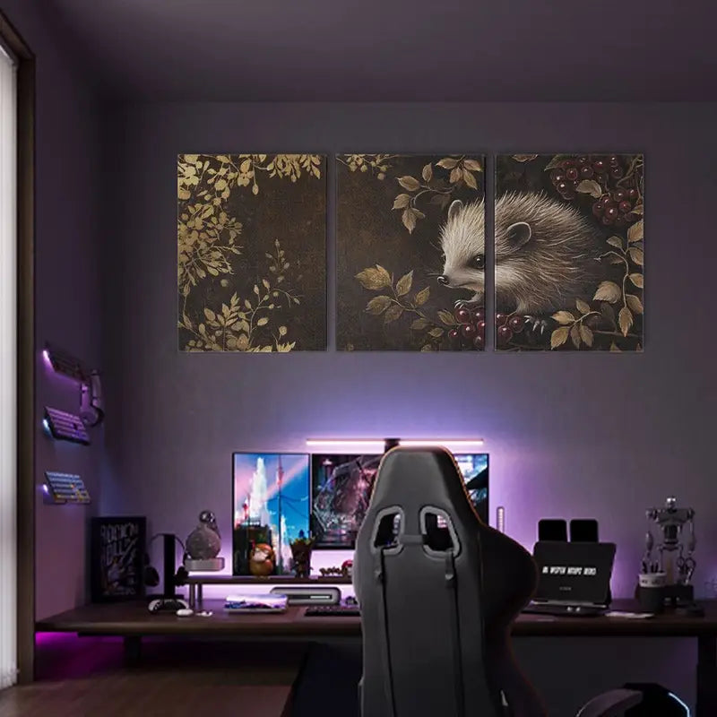 3pcs Cute Hedgehog Charming Animal Design with Floral Metal Print Ready to Hang Art