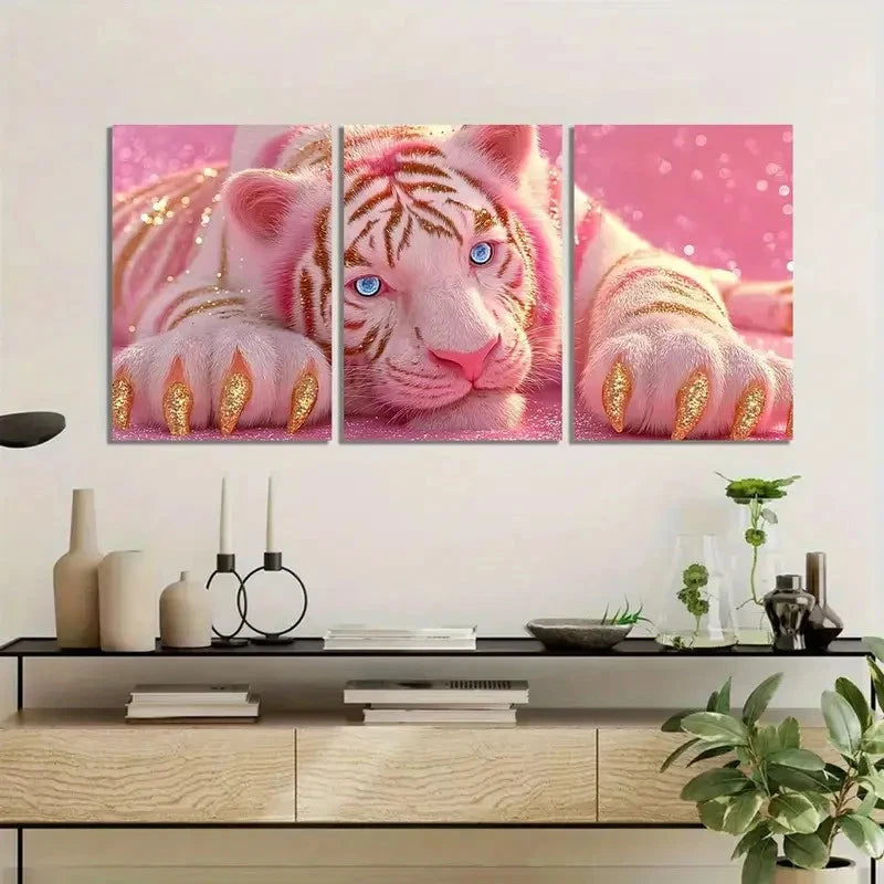 3pcs Cute White Tiger in Pink Background Metal Print Ready to Hang Art