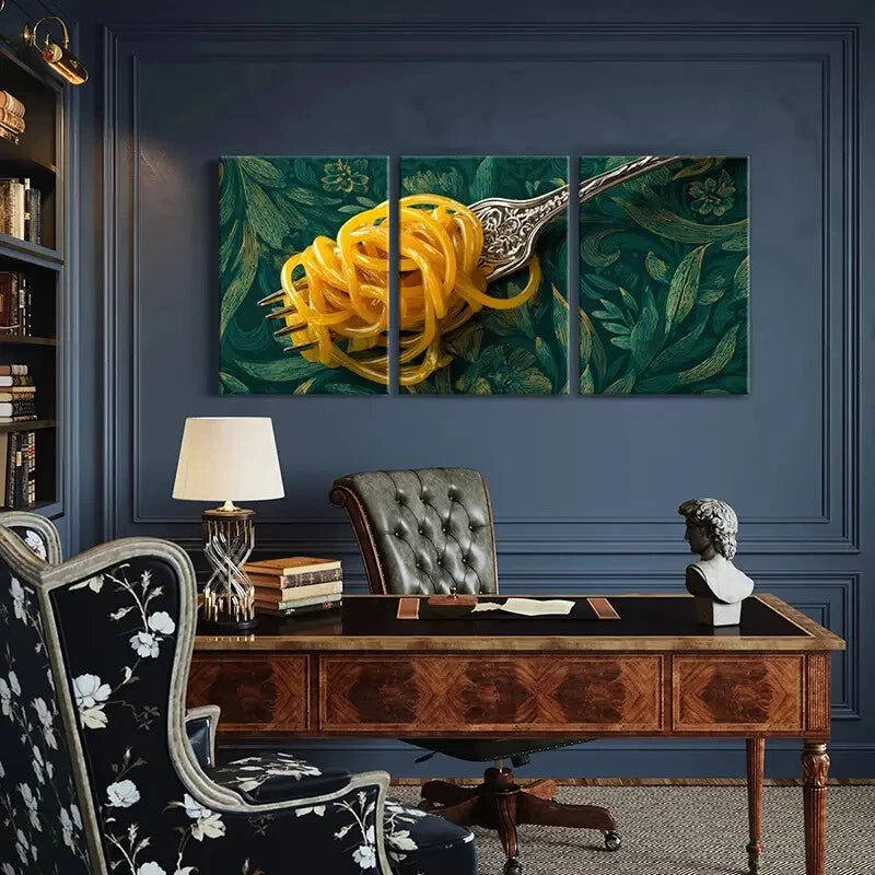 3pcs Elegant Silvery Fork Golden Noodles Metal Print Ready to Hang Art