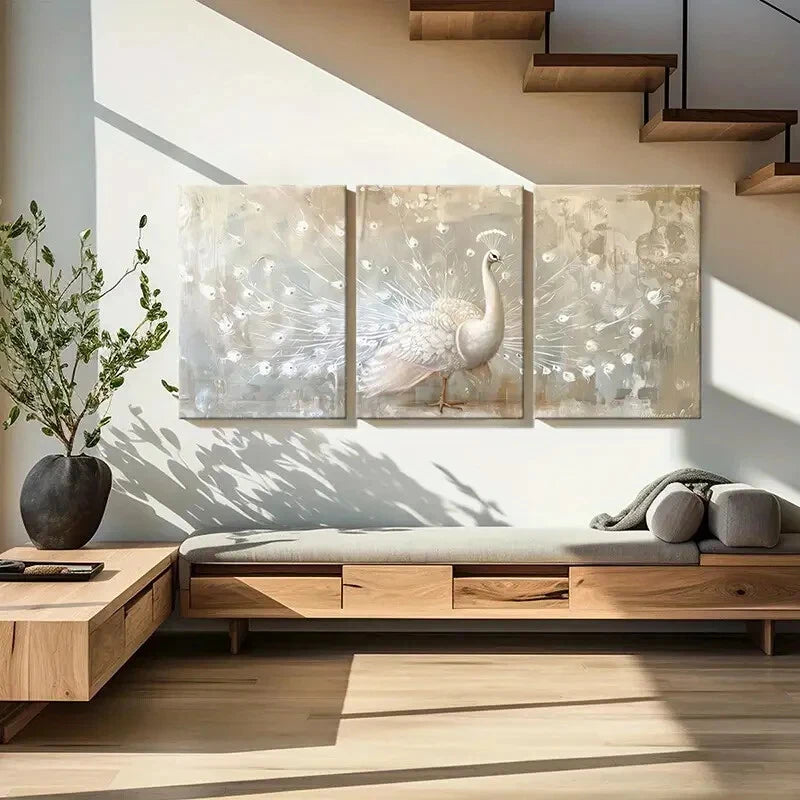 3pcs Elegant White Peacock Art Abstract Feather Metal Print Ready to Hang Art