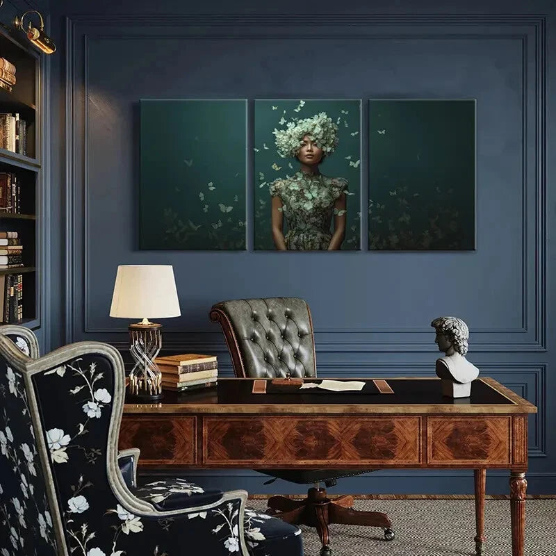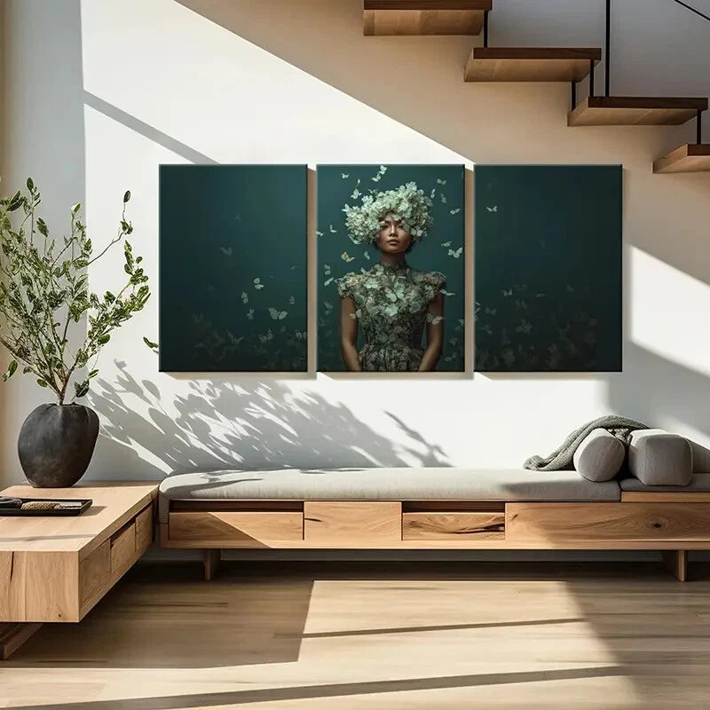 3pcs Elegant Woman Floral Crown Butterfly Surround Metal Print Ready to Hang Art