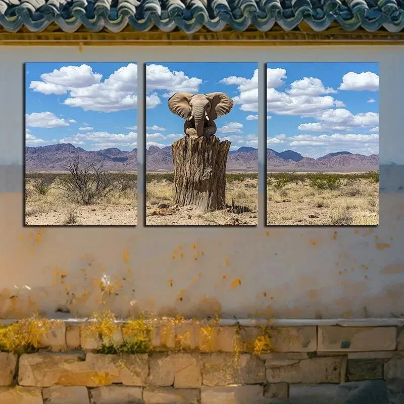 3pcs Elephant on Tree Trunk Illustration Metal Print Ready to Hang Art