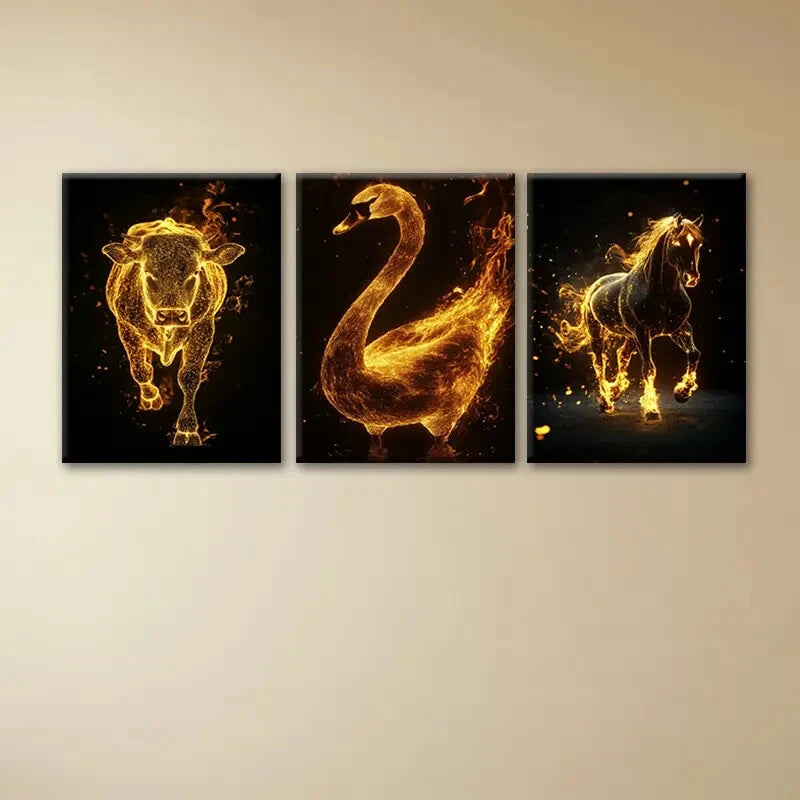 3pcs Fiery Animals Cows Swans and Horses Metal Print Ready to Hang Art