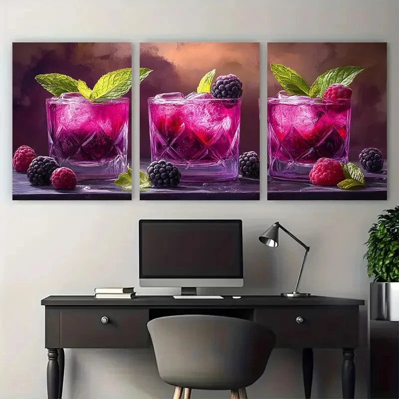 3pcs Fresh Berry Raspberry Blackberry Mint Metal Print Ready to Hang Art