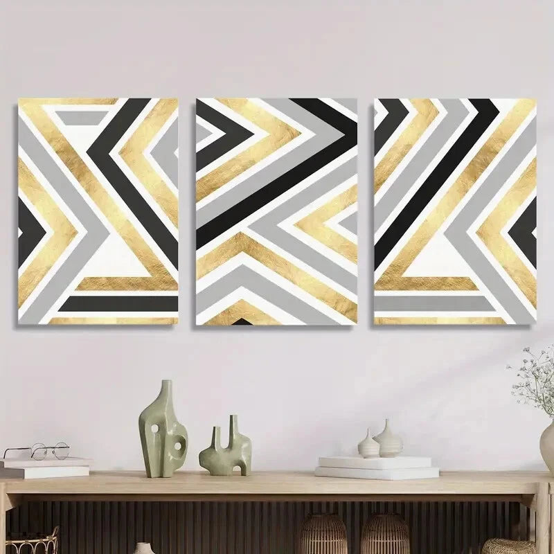 3pcs ,Golden artistic lines, golden black gray Metal Print Ready to Hang Art