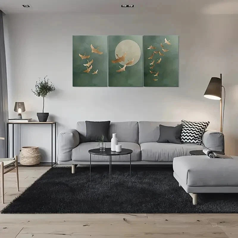 3pcs Golden Birds Moonlit Night Sky with Green Metal Print Ready to Hang Art