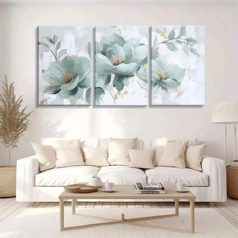 3pcs Green & White Flowers with Golden Accents Metal Print Ready to Hang Art