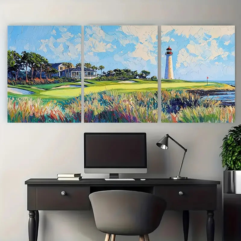 3pcs Harbor Town Golf Course Lighthouse Metal Print Ready to Hang Art