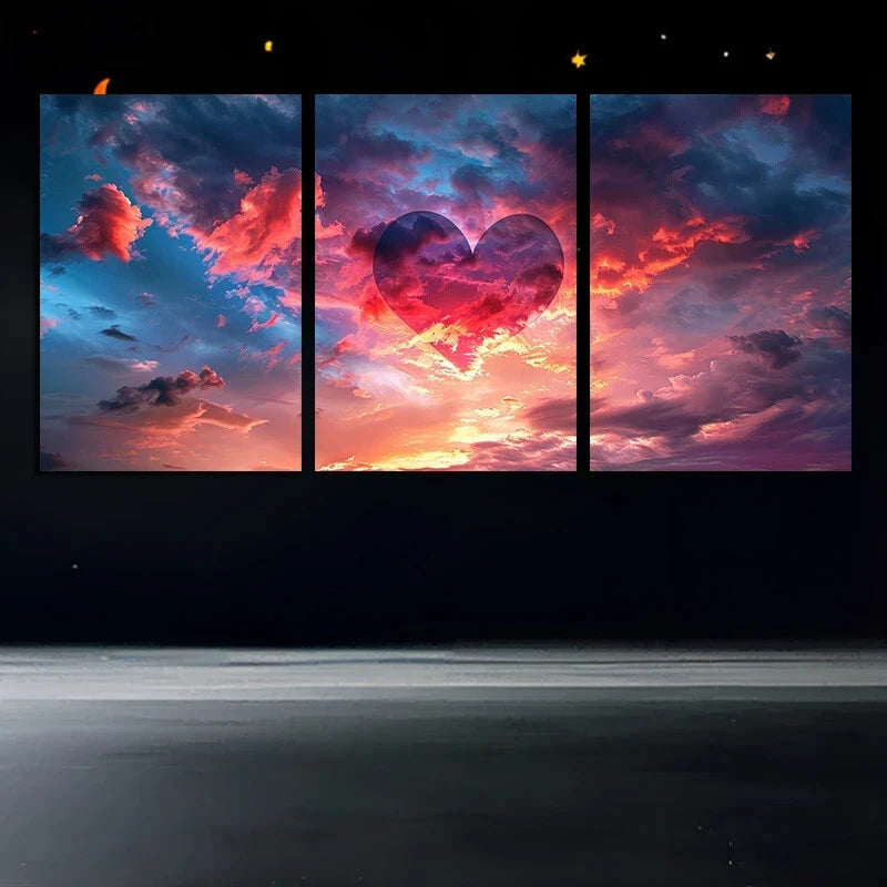3pcs Heart-Shaped Cloud Romantic Sunset Sky Metal Print Ready to Hang Art