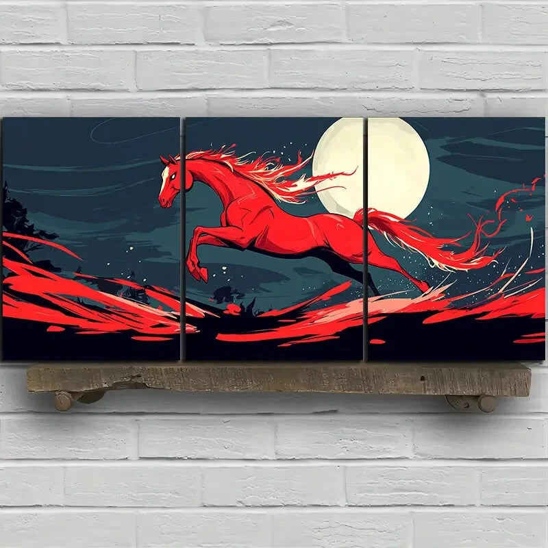 3pcs Horse Jumping Under Moonlight Red Themed Metal Print Ready to Hang Art