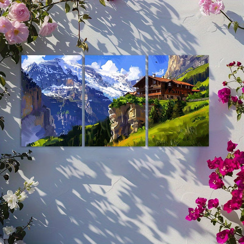 3pcs Large Mountain Hut in The Swiss Mountains Wall Art Set Canvas Framed 50x70cm - High Quality Print 100% Australian Made Wall Canvas Ready to Hang