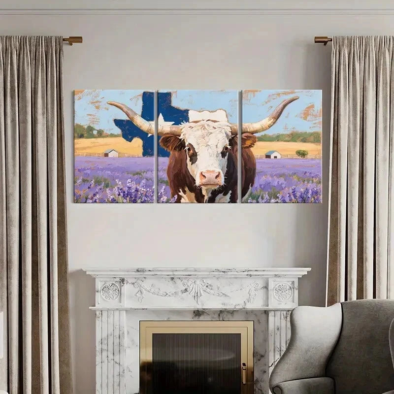 3pcs Lavender Field Rustic Texas Longhorn Cow Metal Print Ready to Hang Art