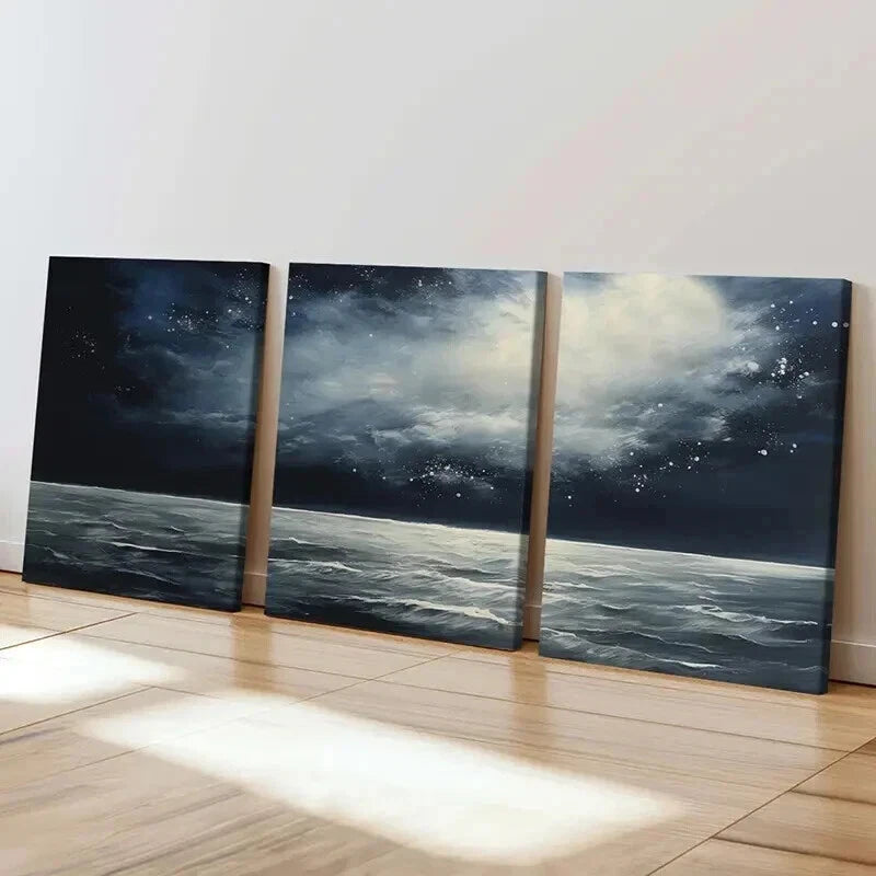 3pcs Moonlit Ocean Waves Dark Sky Clouds Night Wall Art Set Canvas Framed 40x60cm - High Quality Print 100% Australian Made Wall Canvas Ready to Hang