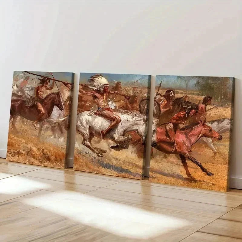 3pcs Native Americans On Horses Red Indians Wall Art Set Canvas Framed 40x60cm - High Quality Print 100% Australian Made Wall Canvas Ready to Hang