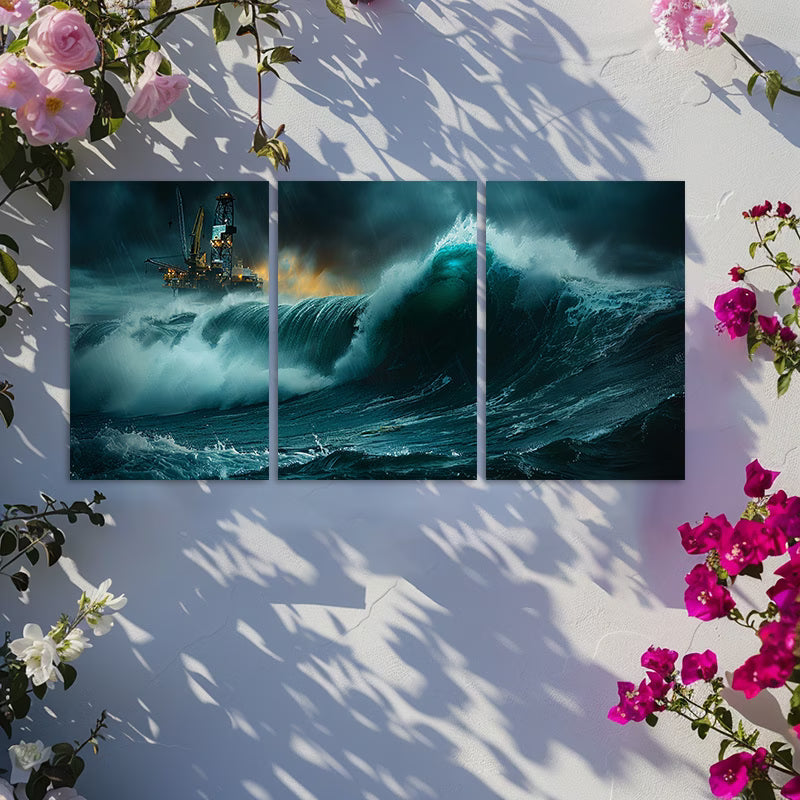 3pcs Ocean Wave and Oil Rig Scene Wall Art Set Canvas Framed 60x90cm - High Quality Print 100% Australian Made Wall Canvas Ready to Hang