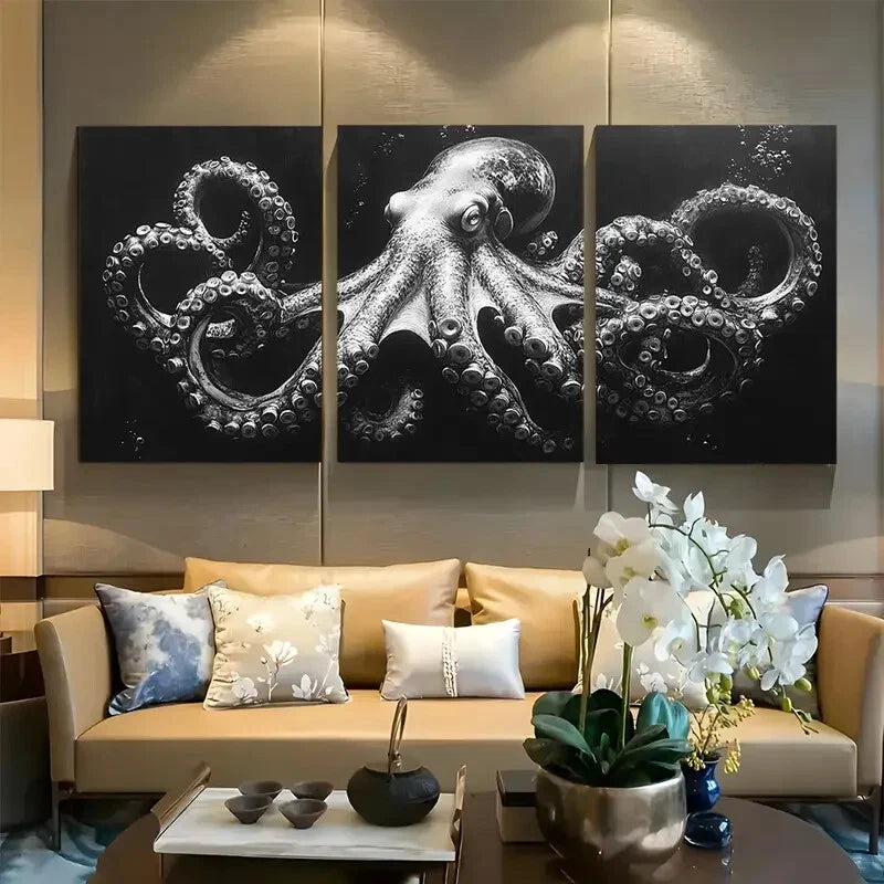 3pcs Octopus Monochrome Charcoal Design Metal Print Ready to Hang Art
