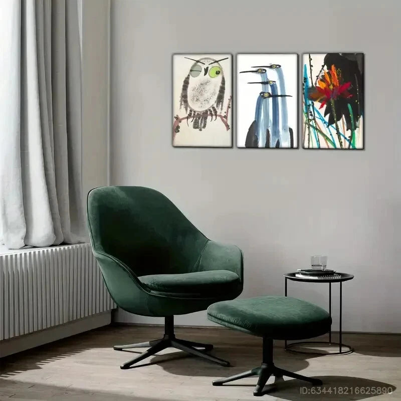 3pcs One- Eyed Owl Antique Crane Watercolor Paint Metal Print Ready to Hang Art