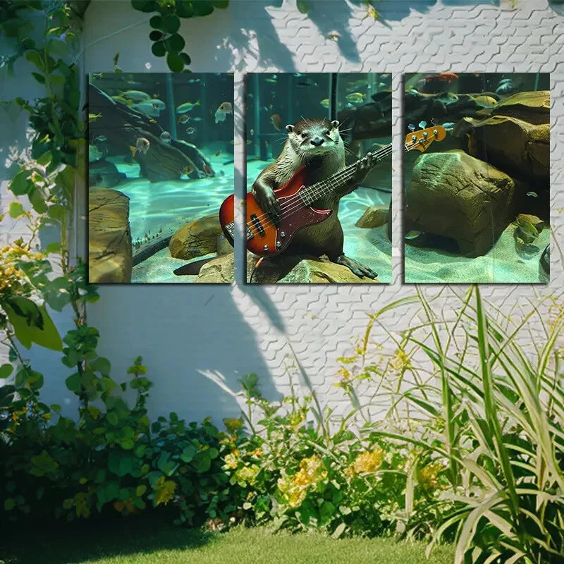 3pcs Otter Playing Guitar with Fish Metal Print Ready to Hang Art