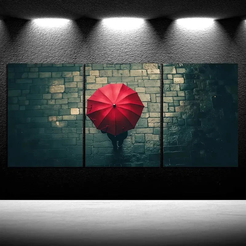 3pcs People With Red Umbrellas on Rainy Streets Metal Print Ready to Hang Art
