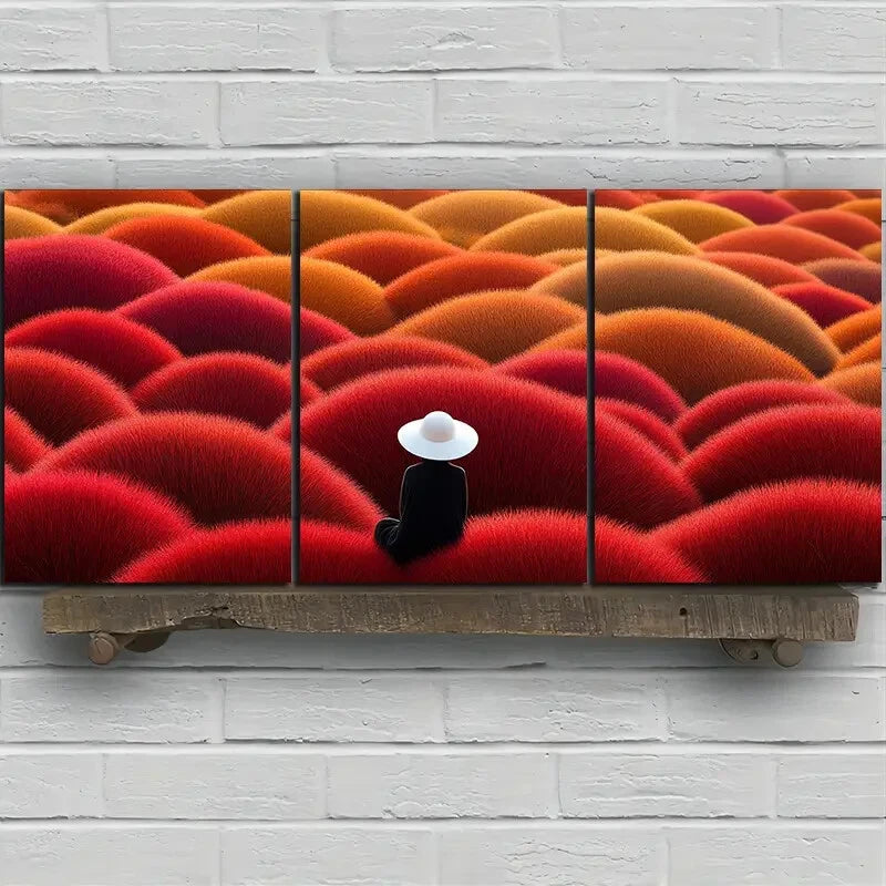 3pcs Person Wearing a Straw Hat Sitting On Field Metal Print Ready to Hang Art