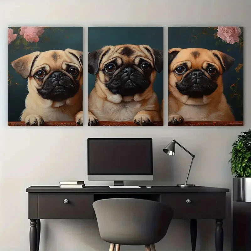 3pcs Pug Dog Portrait Cute Animals Metal Print Ready to Hang Art