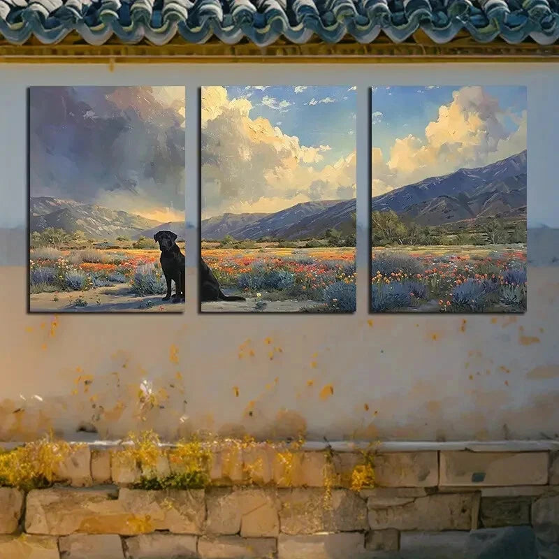 3pcs Rainbow Flowers and A Little Dog on The Field Metal Print Ready to Hang Art