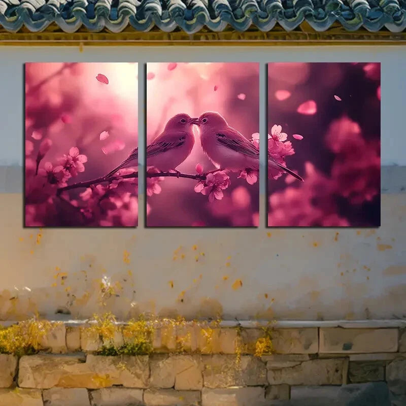 3pcs Romantic Birds on Branch Pink Illustration Metal Print Ready to Hang Art