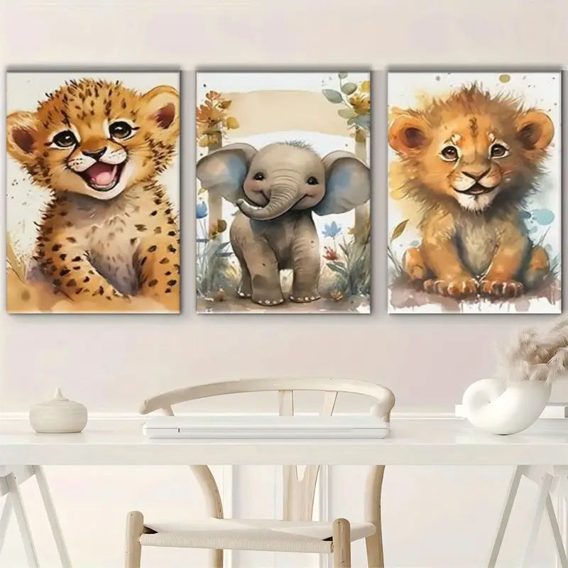3pcs Rustic Jungle Animal Cheetah, Lion, Elephant Metal Print Ready to Hang Art