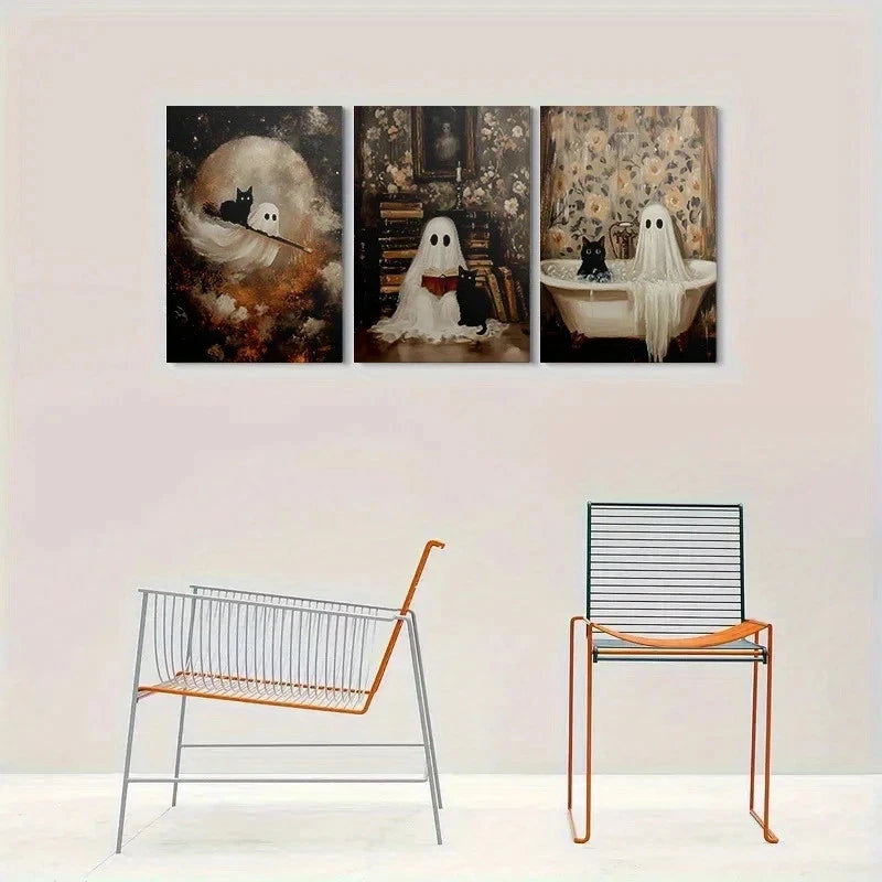 3pcs Spooky Halloween Ghosts with Black Cat Metal Print Ready to Hang Art