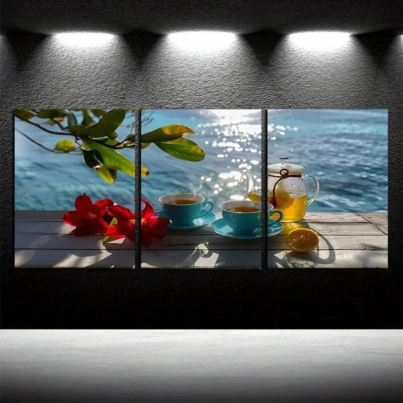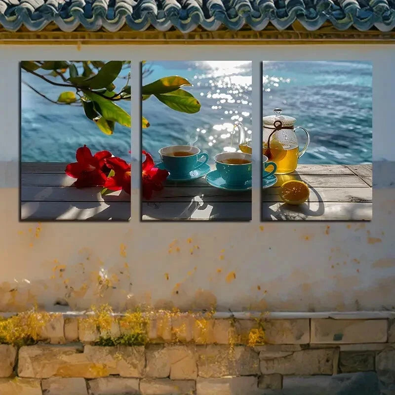 3pcs Tea Leaves and Lemons Standing on a Table Metal Print Ready to Hang Art