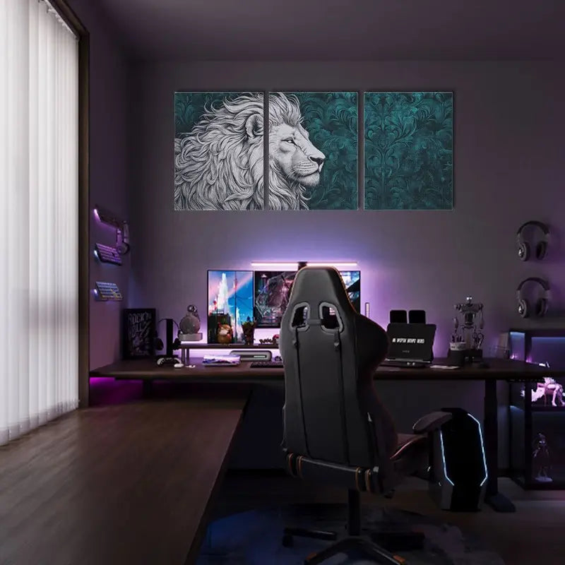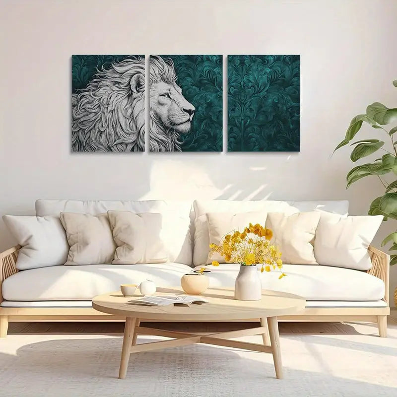 3pcs Teal Patterns, White Lion Head Design Metal Print Ready to Hang Art