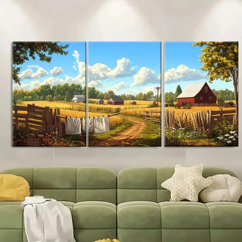 3pcs Traditional Country Life with Red Barn White Metal Print Ready to Hang Art