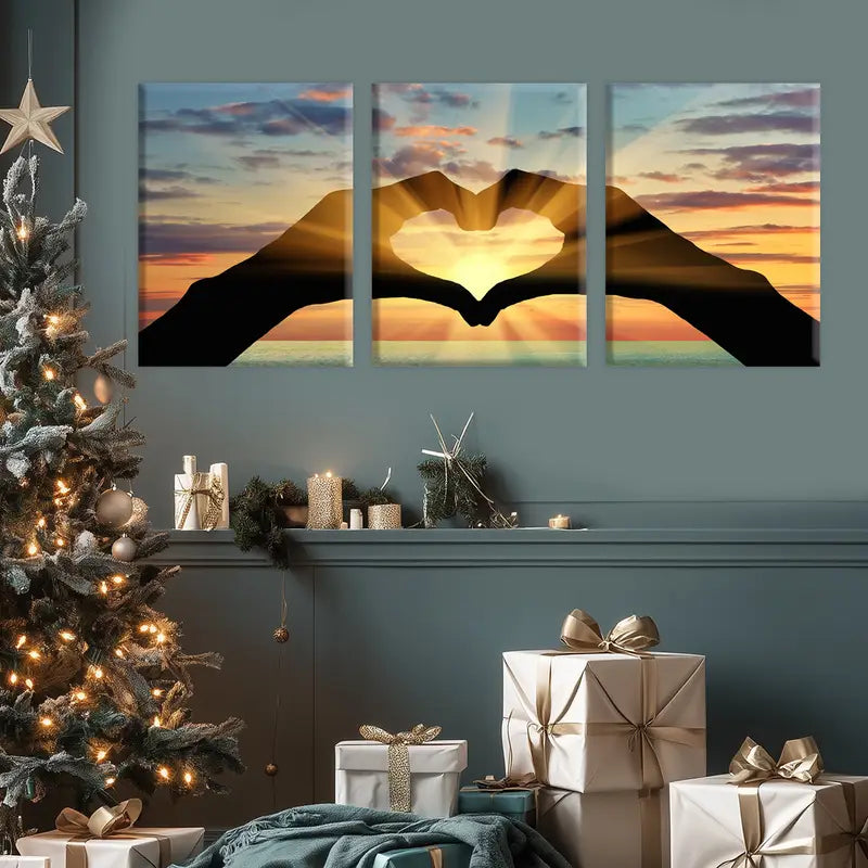 3pcs Triptych Sunset Heart Hands & Ocean Line Metal Print Ready to Hang Art
