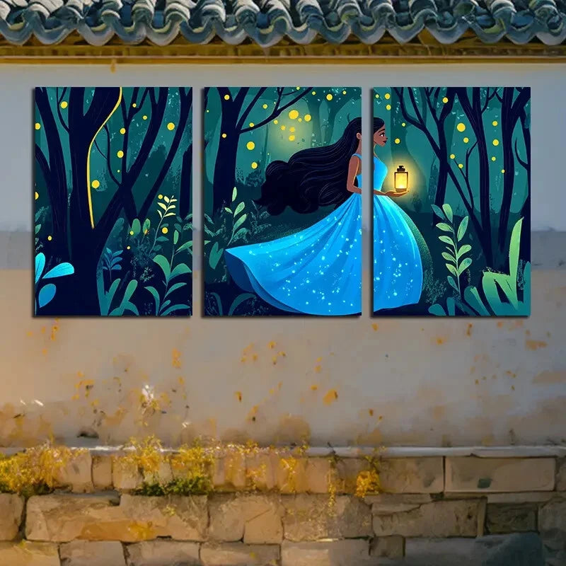 3pcs Vibrant Girl in the Forest with Fireflies Metal Print Ready to Hang Art