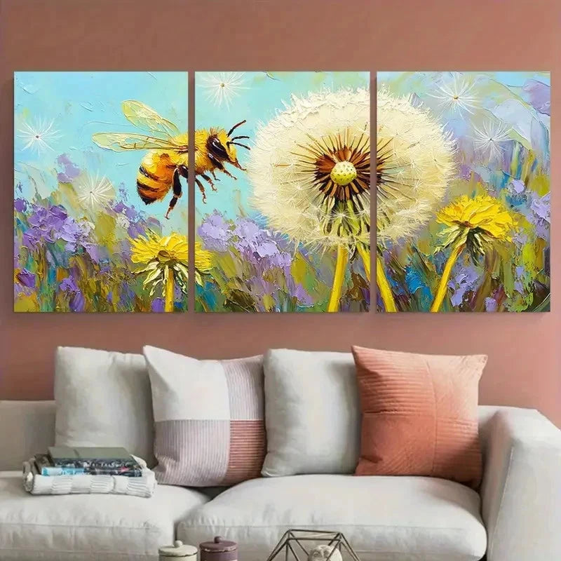3pcs Vibrant Honeybee & Dandelion Floral Meadow Metal Print Ready to Hang Art