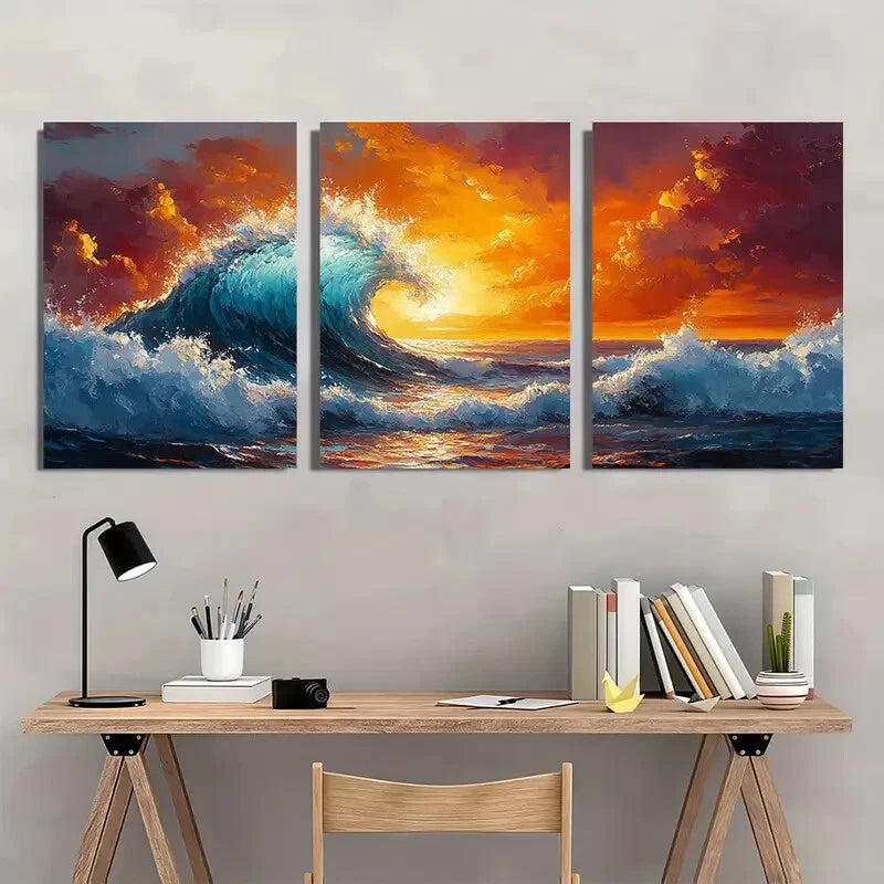 3pcs Vibrant Sunset Ocean Wave Oil Paintings Metal Print Ready to Hang Art