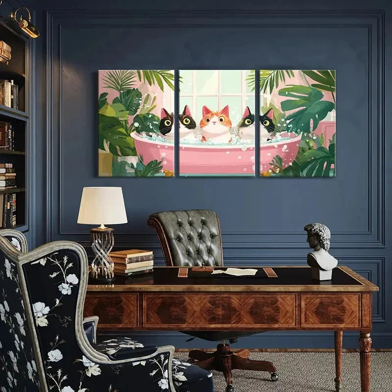 3pcs Whimsical Cats in Bathtub Tropical Plants Metal Print Ready to Hang Art