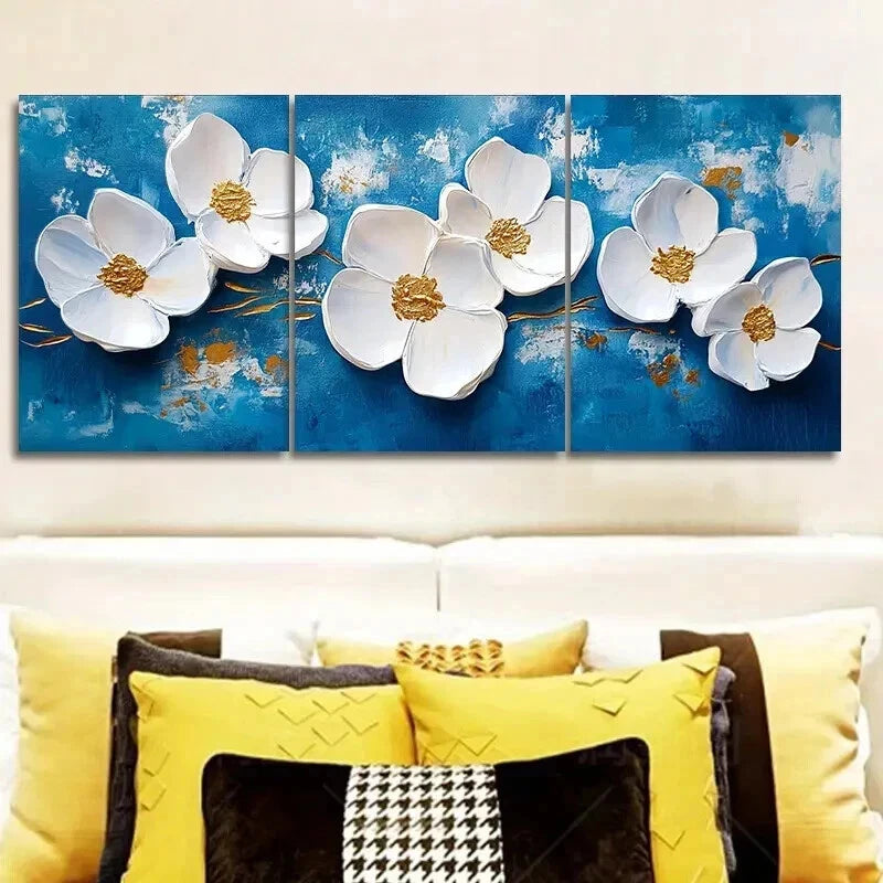 3pcs White Flowers on a Blue Background Wall Art Set Canvas Framed 40x60cm - High Quality Print 100% Australian Made Wall Canvas Ready to Hang