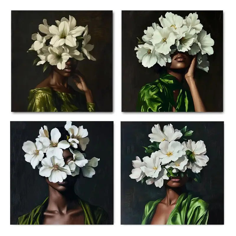 4pcs Green Lady Flower Picture Wall Art Canvas Framed