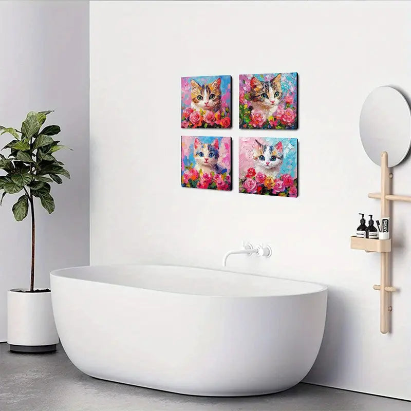 4pcs Orange cat pink flowers Wall Art Canvas Framed