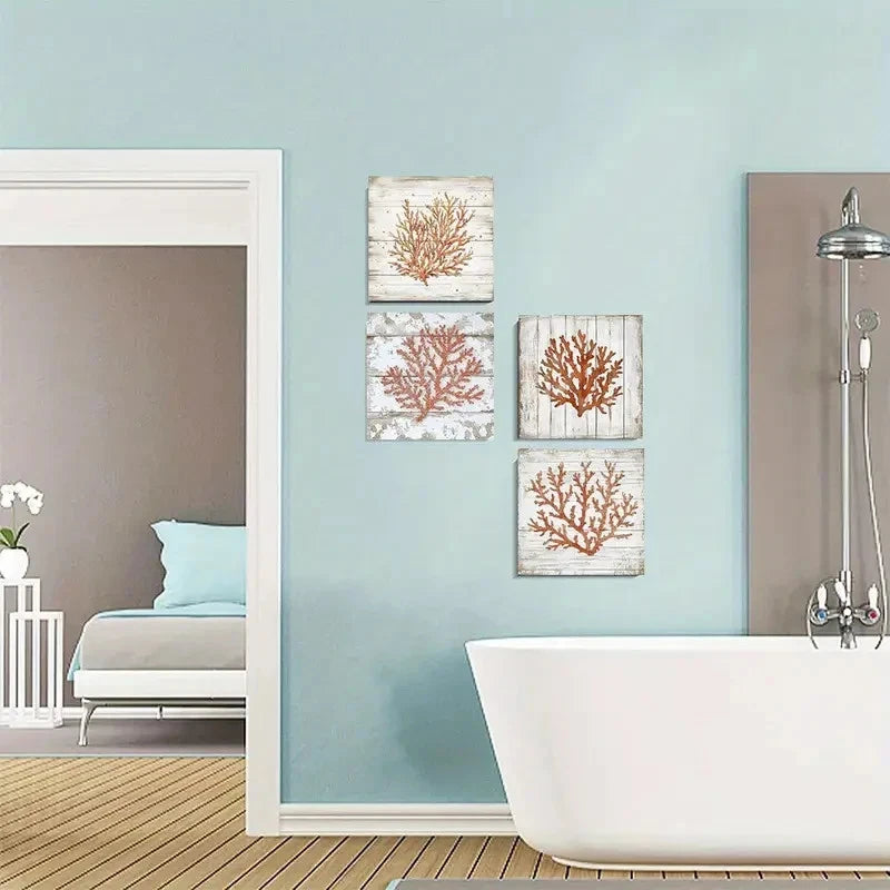 4pcs Orange Coral Beach Poster Wall Art Canvas Framed