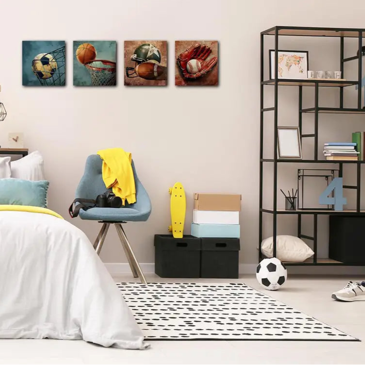 4pcs Rustic Football Baseball Basketball Soccer Wall Art Canvas Framed