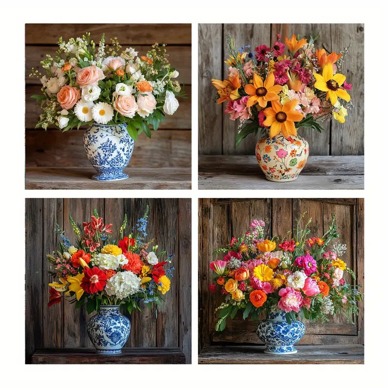 4pcsVibrant Bouquet Art Prints in Blue And Whit Wall Art Canvas Framed