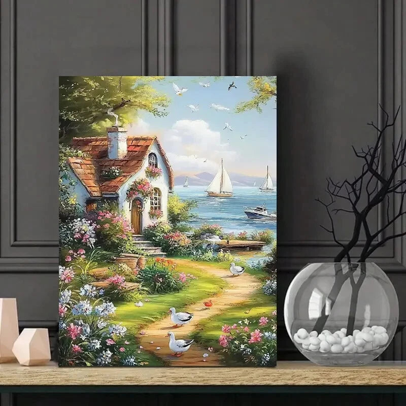 Beautiful Cottage by The Sea with Flowers And Ducks 40x60cm Metal Print Ready to Hang