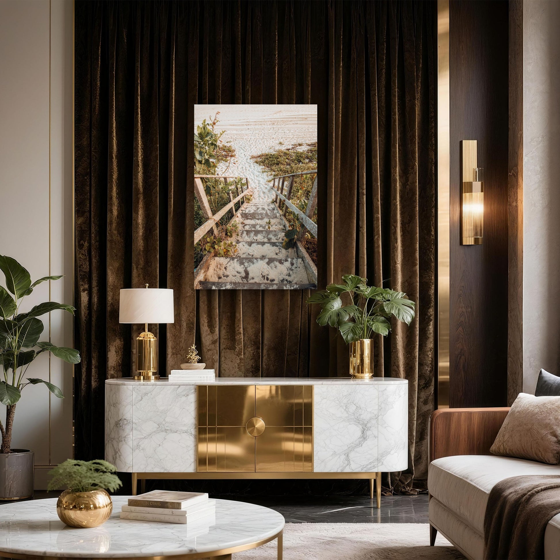 Beautiful Shot Stairs Beach With Golden Sunset Colors 60x90cm Metal Print Ready to Hang