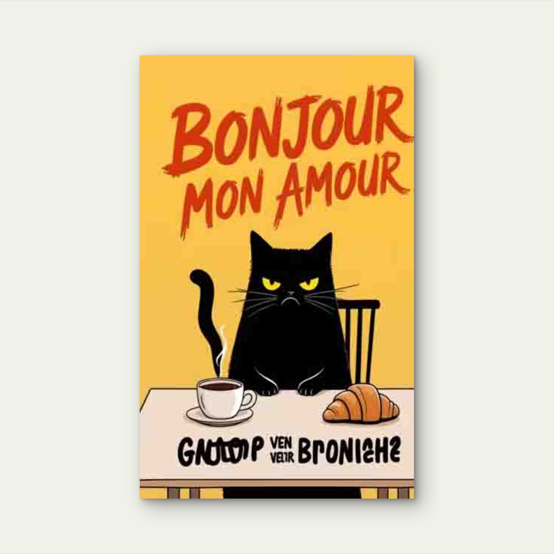 Black Cat Coffee and Croissant Bonjour Mon Amour Metal Print Ready to Hang