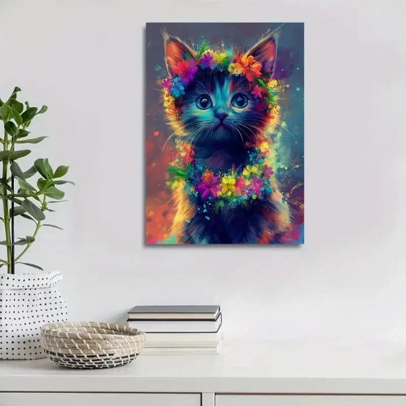 Charming Kitten with Floral Wreath Painting 40x60cm Metal Print Ready to Hang