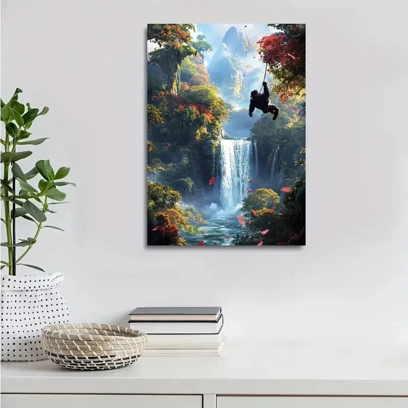 Colorful Jungle Scene with Waterfall Gorilla Painting 40x60cm Metal Print Ready to Hang