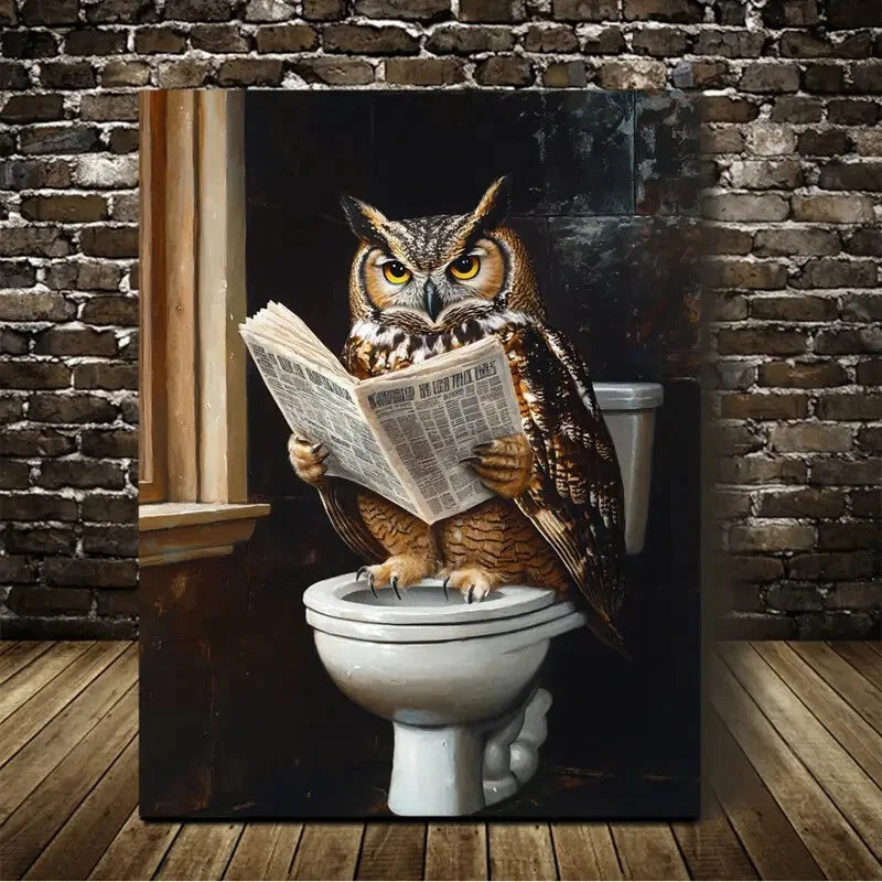 Contemporary Owl Reading Newspaper Painting 40x60cm Metal Print Ready to Hang