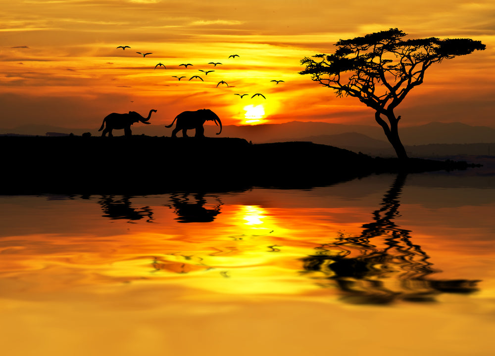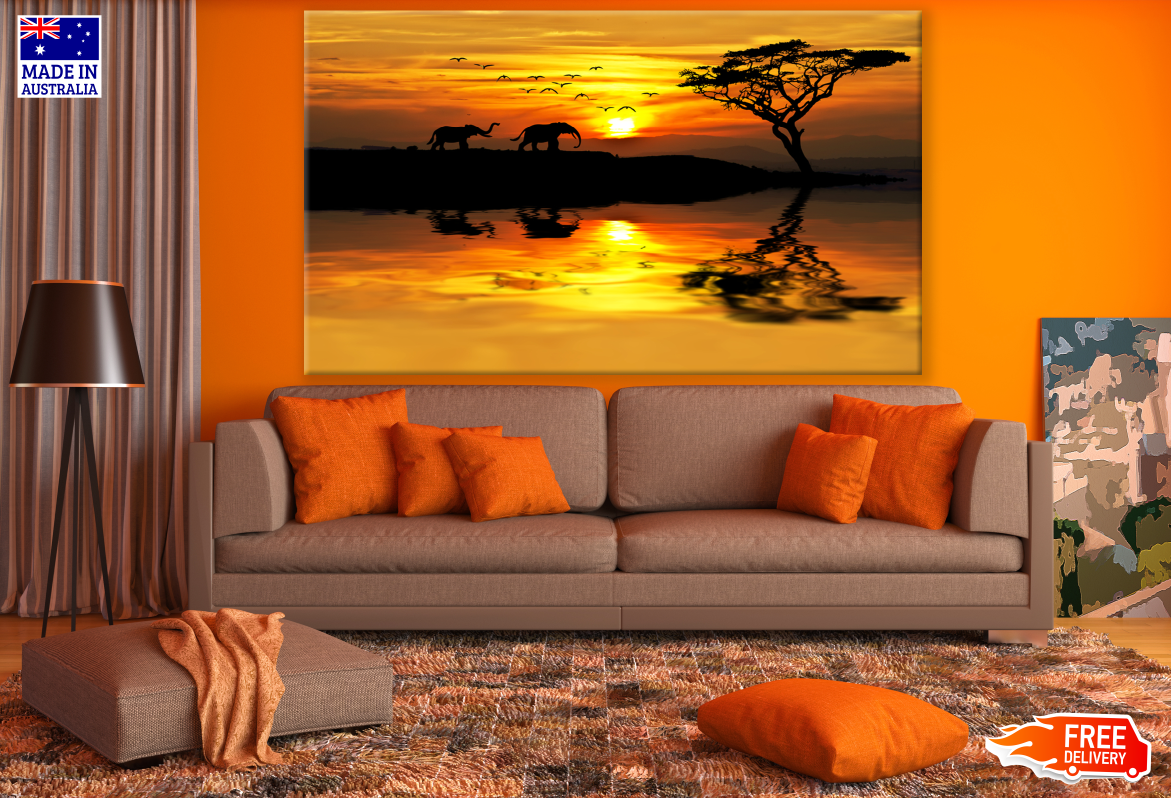 Elephants Walking on a River Bank Sunset Print 100% Australian Made